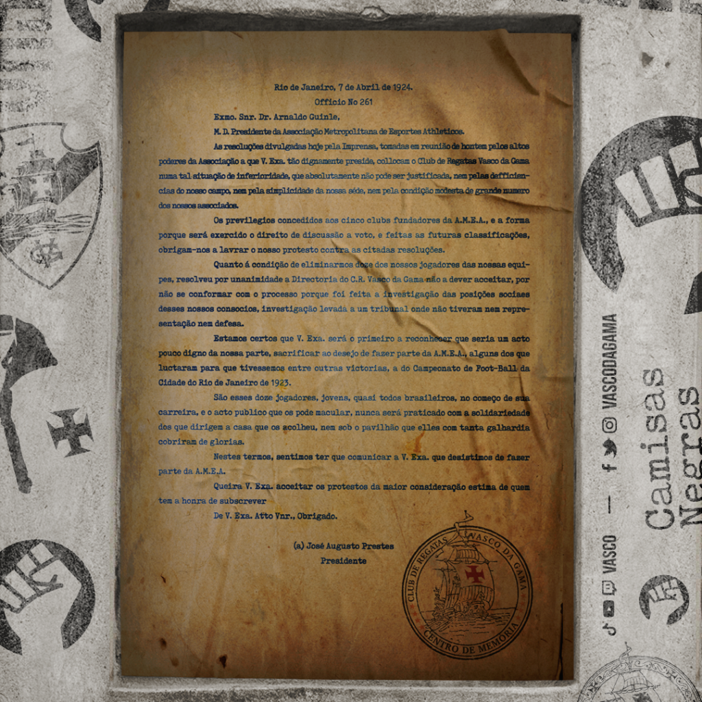 “Quanto à condição de eliminarmos doze dos nossos jogadores das nossas equipes, resolveu por unanimidade a Diretoria do C.R. Vasco da Gama não a dever aceitar, por não se conformar com o processo porque foi feita a investigação das posições sociais desses nossos consócios, investigação legada a um tribunal onde não tiveram nem representação nem defesa. (…) São esses doze jogadores, jovens, quase todos brasileiros, no começo de sua carreira, e o ato público que os pode macular, nunca será praticado com a solidariedade dos que dirigem a casa que os acolheu, nem sob o pavilhão que eles com tanta galhardia cobriram de glórias. Nestes termos, sentimos ter que comunicar a V. Exa. que desistimos de fazer parte da A.M.E.A.”